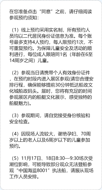 今年船艇展示活动采取“扫码预约注册,摇号中签”模式,为方便市民预约参观,活动推出了“船艇展示预约系统”,于11月10日中午12点准时开放注册,分上午、下午报名,每个手机号最多可注册4个人信息。11月15日中午12点,系统将随机抽签确定中签观众和参观时段并短信通知中签观众。
