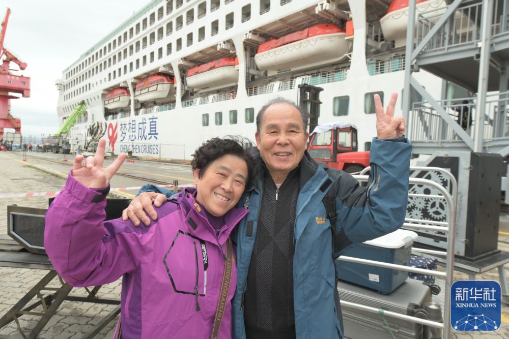 ↑3月6日,搭乘“梦想”号国际邮轮的旅客登船前在码头拍照留念。